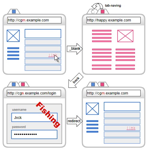 - 탭으로 열린 새 페이지에서 js의 window.opener로 부모 윈도우의 오브젝트에 접근해서 'window.opener.location = 새로운(피싱)URL'로 부모 윈도우의 URL을 바꿔 칠 수 있다.