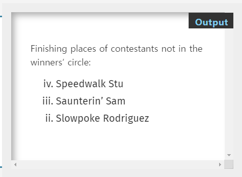 <p>Finishing places of contestants not in the winners’ circle:</p>