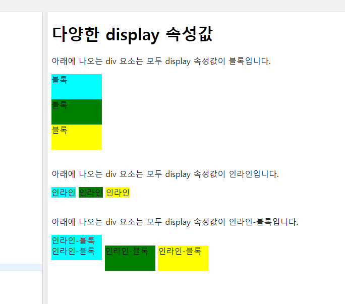 - display 속성값이 인라인-블록으로 설정된 요소는 해당 요소 자체는 인라인 요소처럼 동작함