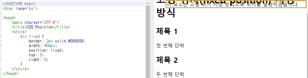 - 즉, 웹페이지가 스크롤되어도 고정 위치로 지정된 요소는 항상 같은 곳에 위치하게 됨
