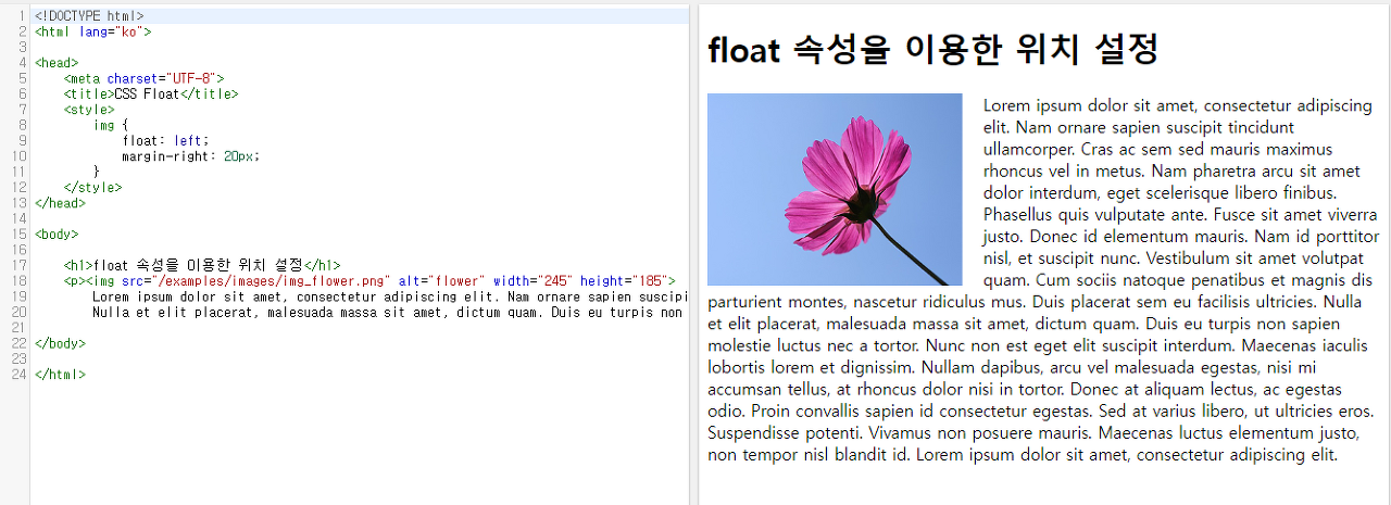 CSS 속성(property) float 은 한 요소(element)가 보통 흐름(normal flow)으로부터 빠져 텍스트 및 인라인(inline) 요소가 그 주위를 감싸는 자기 컨테이너의 좌우측을 따라 배치되어야 함을 지정합니다.