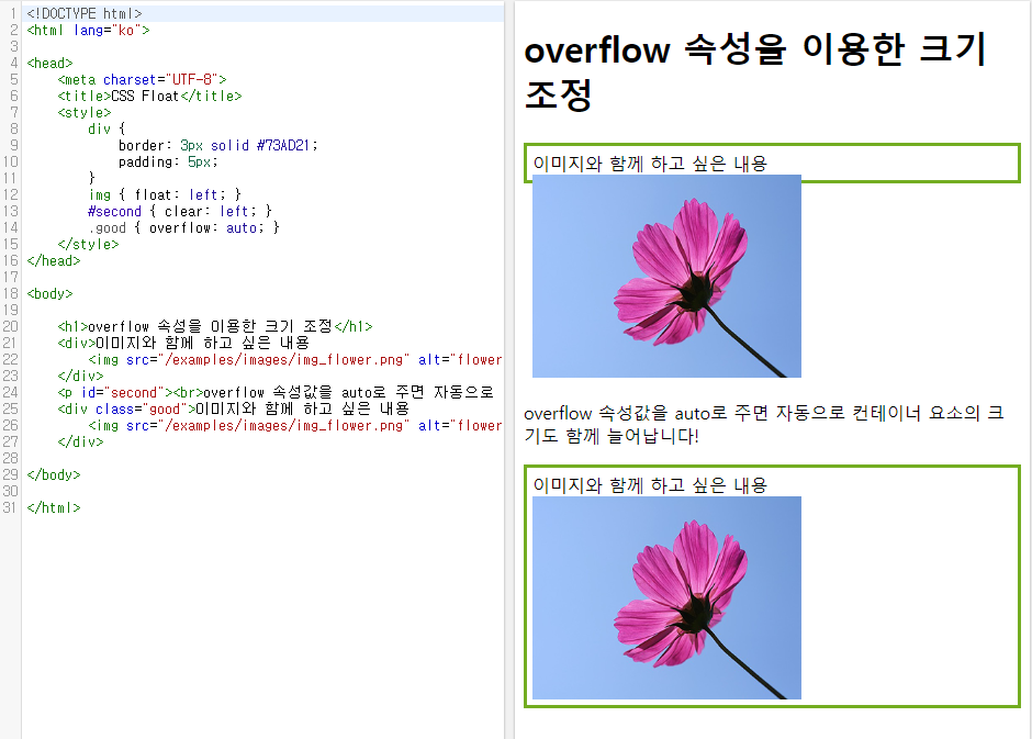 - 이때, overflow 속성값을 auto로 설정하면, 컨테이너 요소의 크기가 자동으로 내부의 요소를 감쌀 수 있을만큼 커지게 됨