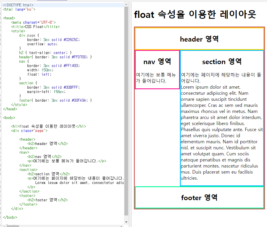 - 컨테이너 요소에 float 속성이 적용되면 그 이후 등장하는 모든 요소들은 정확한 위치를 설정하기 어렵기 때문