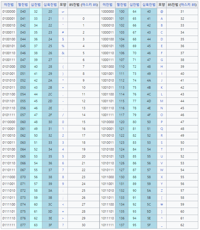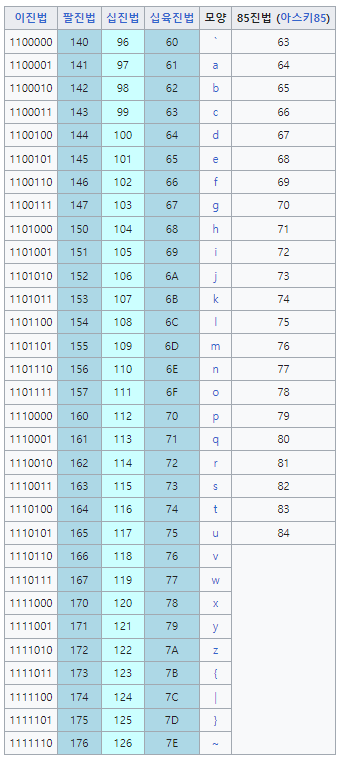 아스키(ASCII)란 미국 국립 표준 협회에서 표준화한 정보 교환용 7비트 부호 체계로, 영문 알파벳을 사용하는 대표적인 문자 인코딩이다. 문자 인코딩은 사용자가 입력한 문자나 기호들을 컴퓨터가 이용할 수 있는 신호로 만드는 것을 말한다.