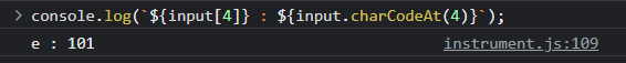 Apple 문자열의 4번째 인덱스값(input[4])인 e의 아스키 코드를 출력하고 싶다면 위와 같이 index값에 해당 문자의 인덱스값을 지정해 주면 된다.