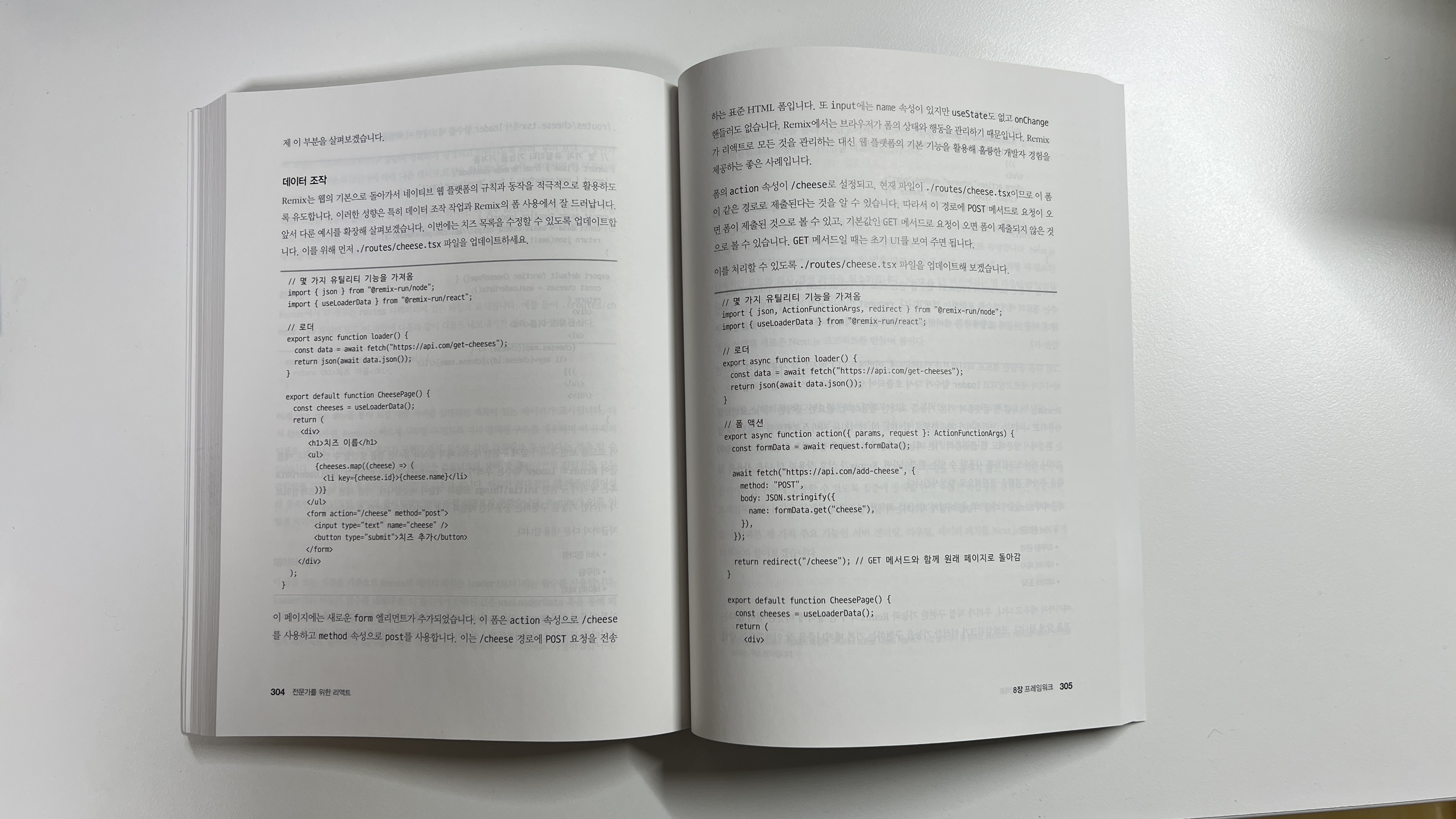이 책에서 특히나 흥미로웠던 점은 두 가지였다. 첫 번째, 리액트뿐만 아니라 리액트를 기반으로 한 next.js와 remix까지 함께 소개한다는 점이다. 넥스트에 대한 자료는 이제 쉽게 찾아볼 수 있지만, 리믹스는 국내에서 대중적으로 사용되지 않기 때문에 한국어 레퍼런스를 찾기가 상대적으로 어렵다. 그런데 이 책에서는 리믹스의 기본 구조와 간단한 사용법을 안내하여 새로운 기술을 한눈에 파악하고 실습해 볼 수 있게 해주는 점이 인상적이었다.