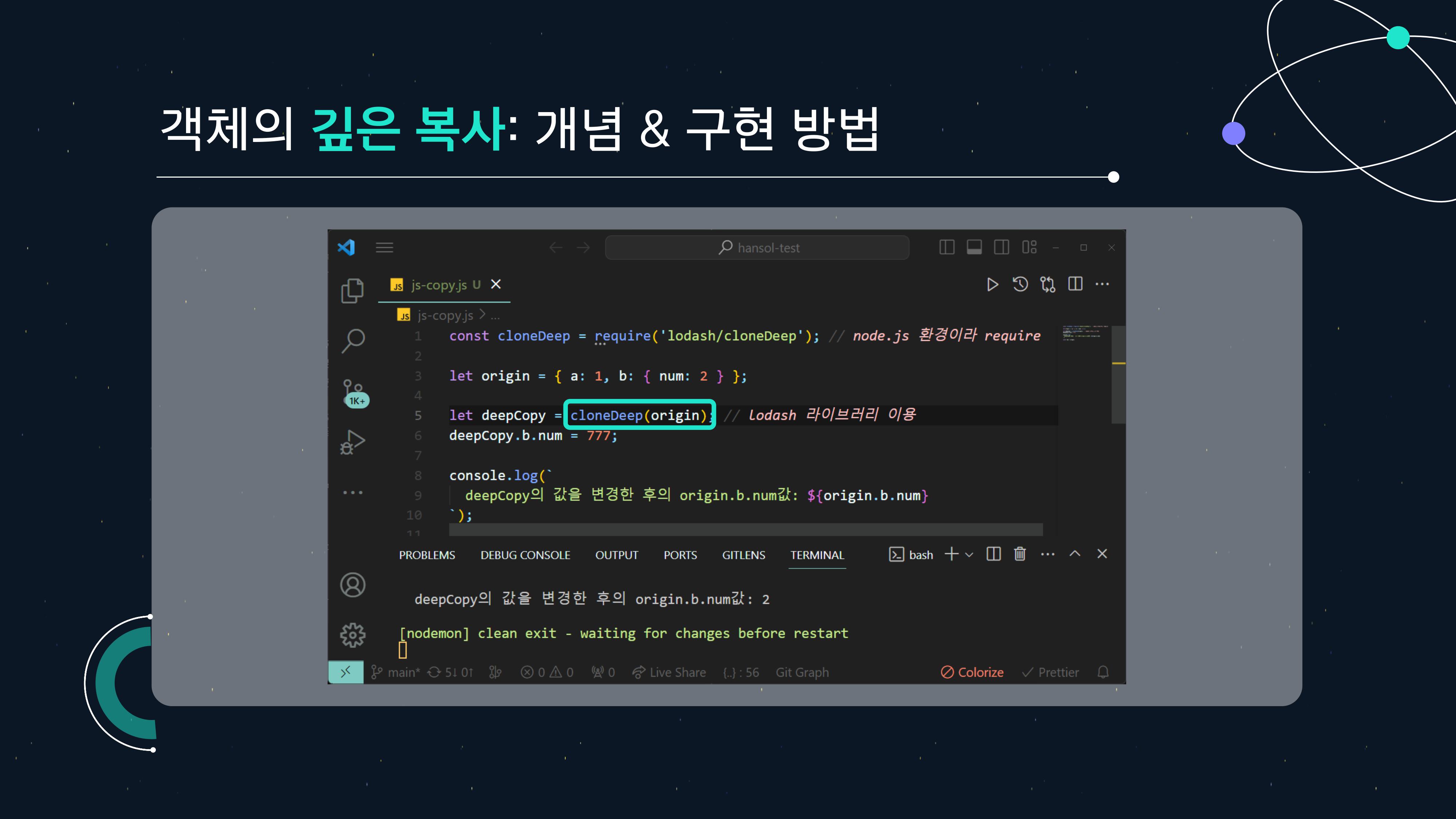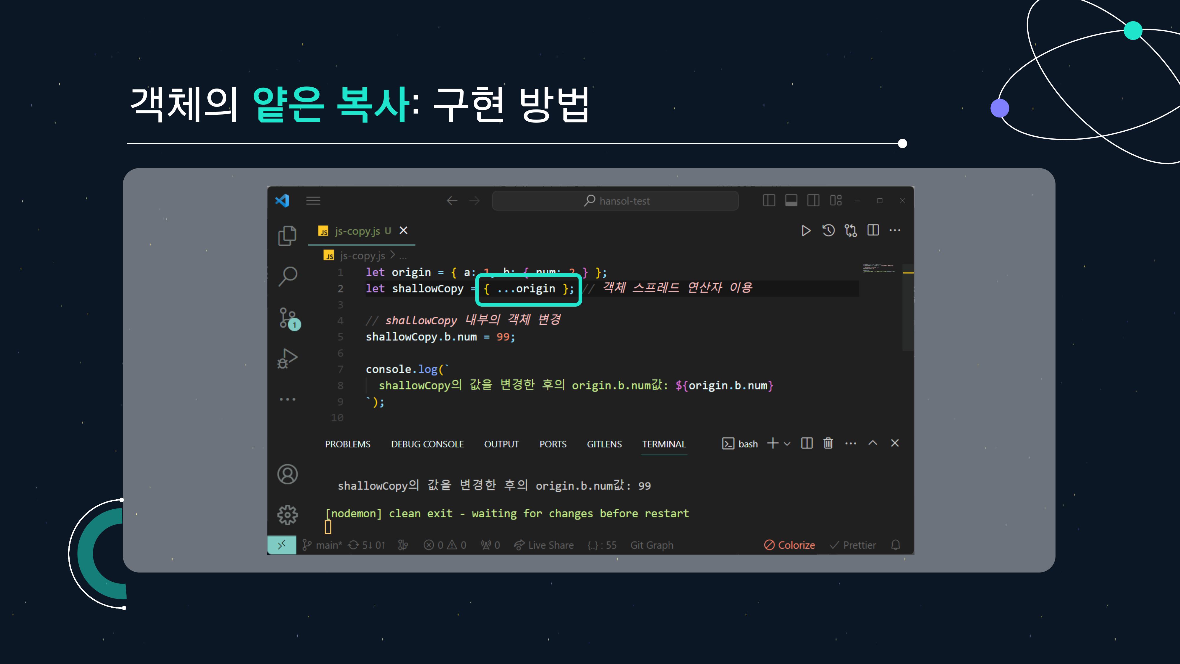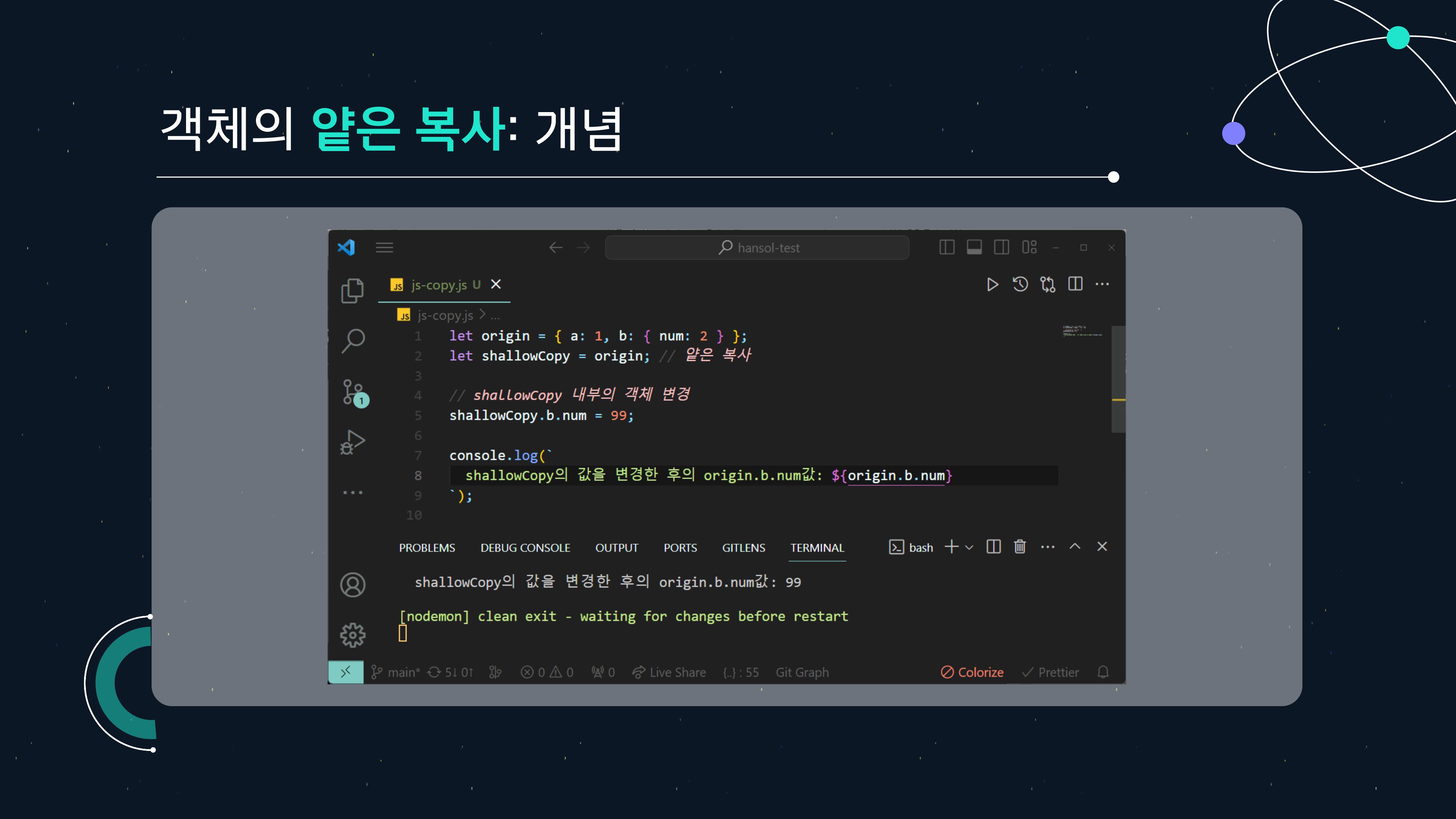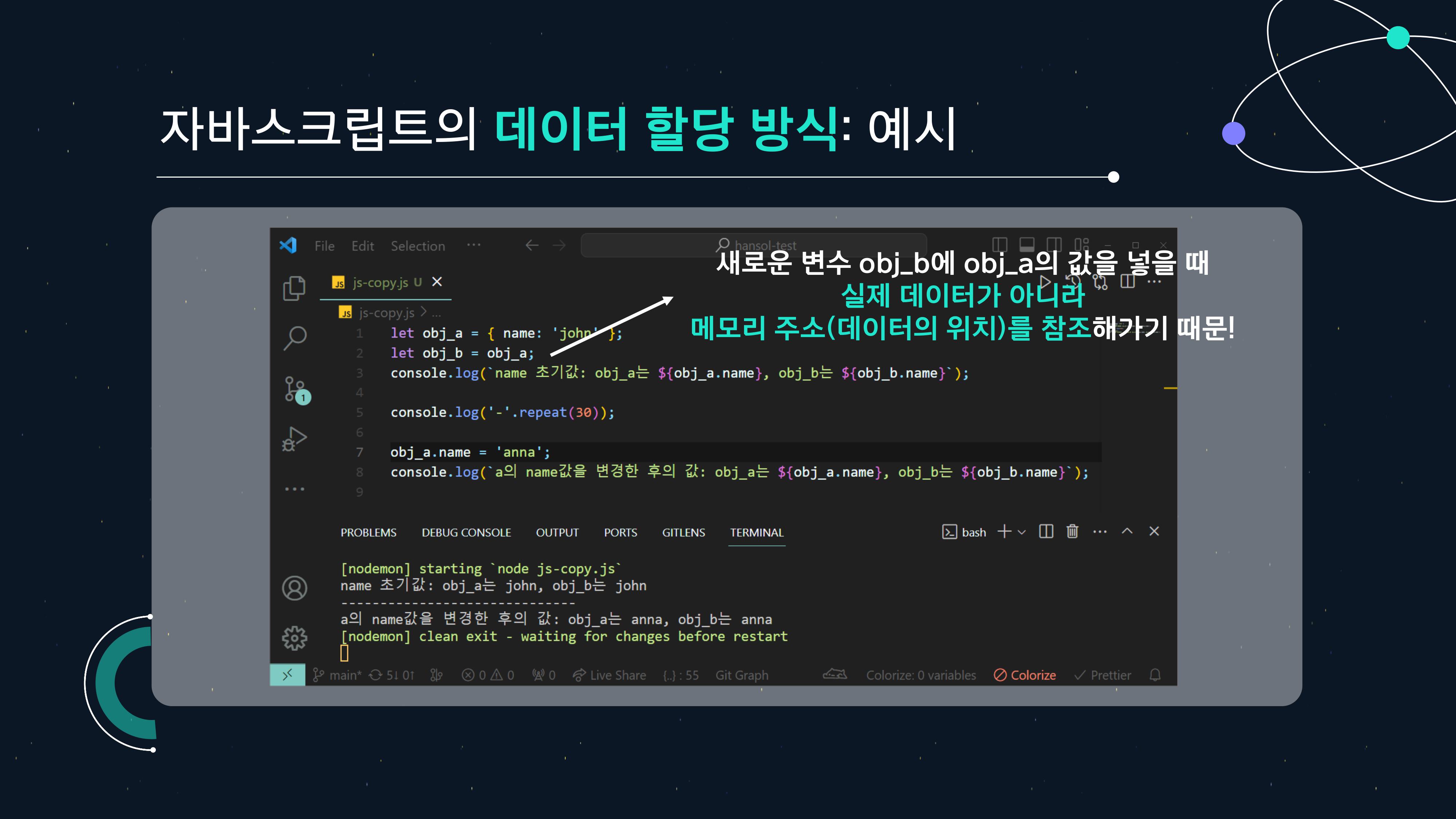 - 따라서 console.log를 실행하면, '초기값 a는 5, b는 5'가 출력된다.
