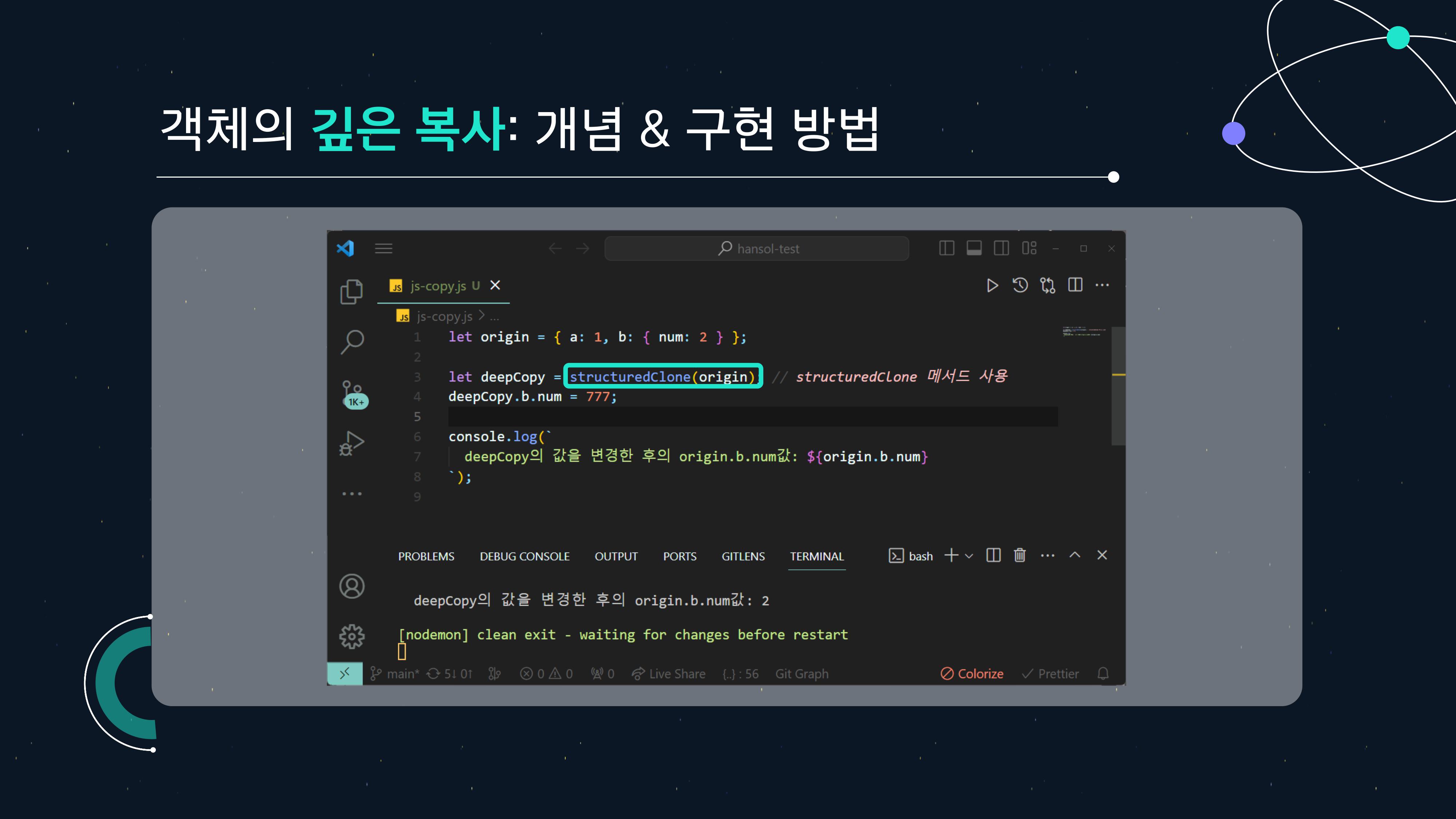 이 외에도 재귀적으로 모든 하위 객체를 복사하여 직접 깊은 복사를 구현하거나, JSON.parse(JSON.stringify(obj))를 활용하는 방법도 있다. 단, JSON.parse(JSON.stringify(obj)) 방식은 function, Symbol, undefined, Date, RegExp 같은 데이터 타입을 올바르게 복사하지 못하는 한계가 있어 주의해야 한다.
