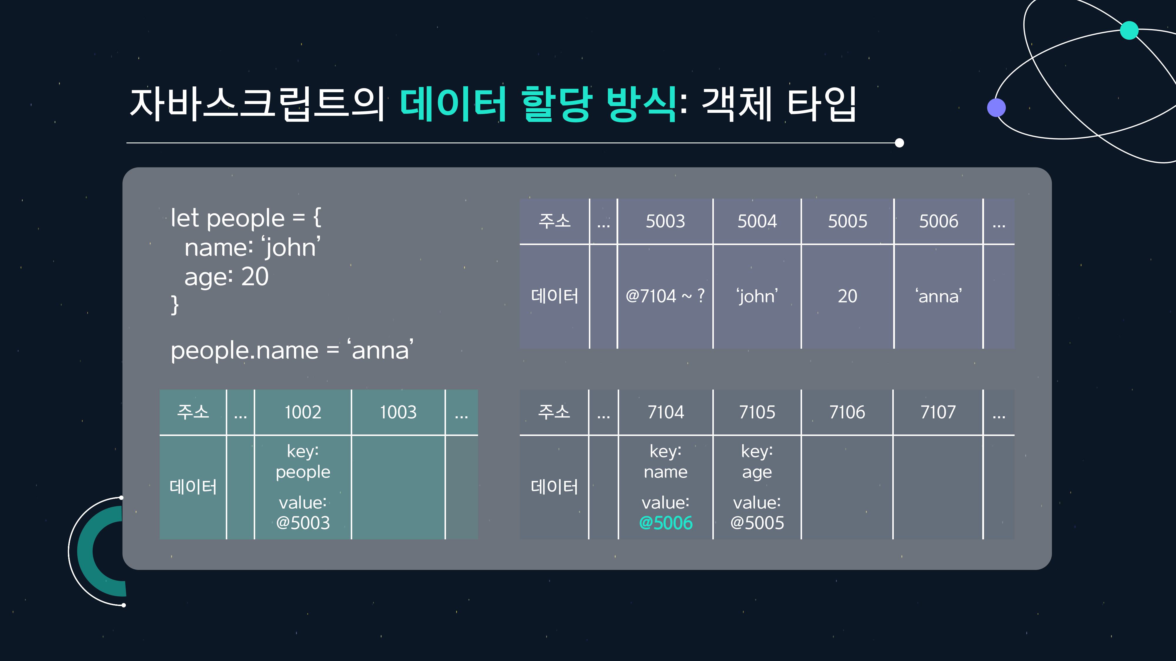 반면 객체는 참조(reference) 값으로 저장되며, 변수에는 객체의 메모리 주소가 저장된다. 새로운 변수를 기존 객체에 할당하면 객체의 참조 값(메모리 주소)만 복사되므로 같은 객체를 가리키게 된다. 따라서, 한 변수를 통해 객체의 속성을 변경하면, 같은 객체를 참조하는 다른 변수도 영향을 받는다.