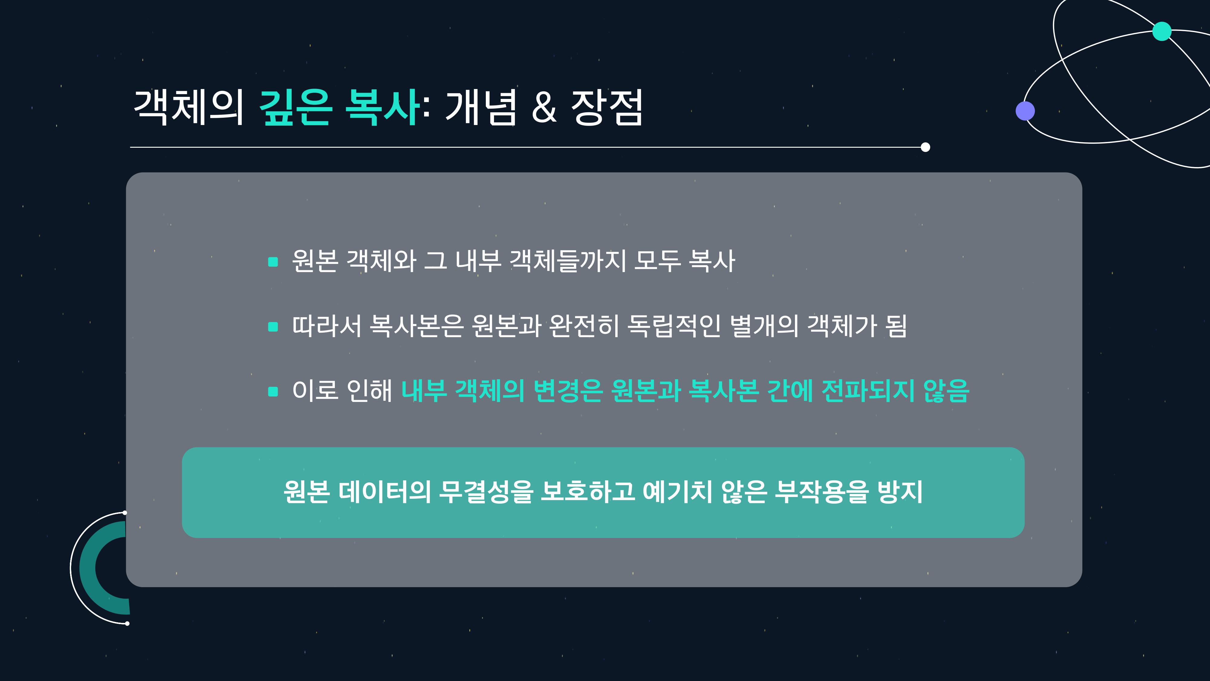 깊은 복사는 원본과 완전히 분리된 새로운 객체가 생성되므로, 수정해도 원본에 영향을 미치지 않는다. 또한 내부 객체까지 새로운 메모리 공간에 저장되므로, 참조 공유 문제가 발생하지 않는다. 이로 인해 깊은 복사를 사용할 경우 원본 데이터의 무결성을 보호하고 예기치 않은 부작용을 방지할 수 있다.