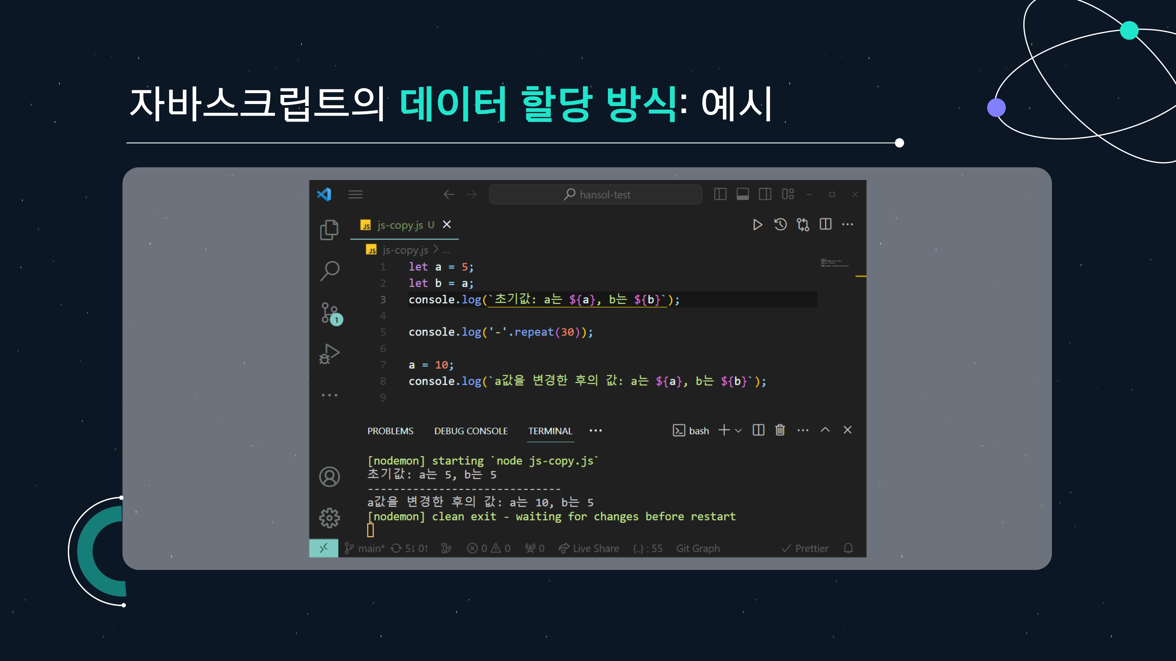 - 이후, a를 10으로 값을 변경하면, a 변수에 새로운 값 10이 저장된다.