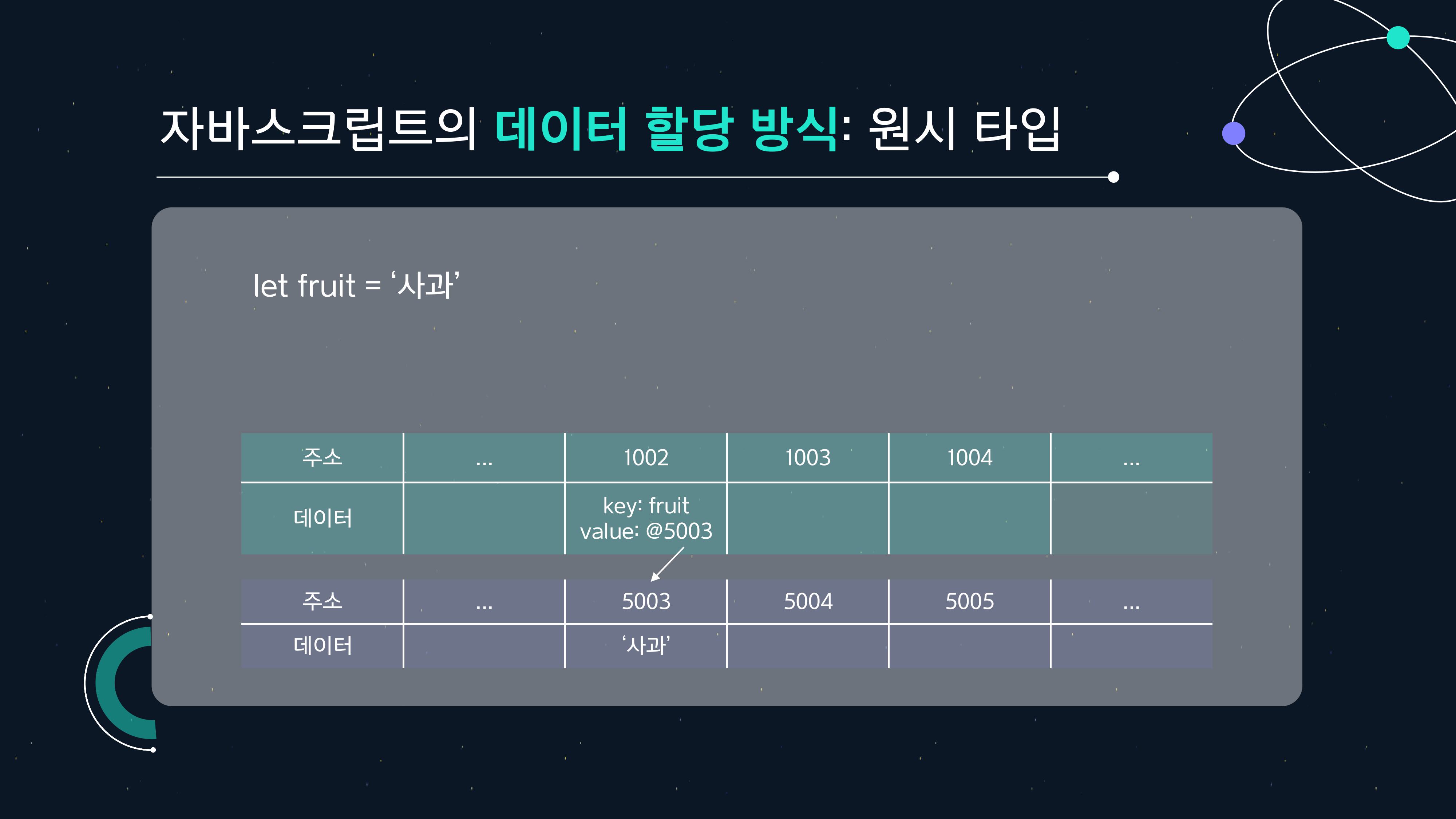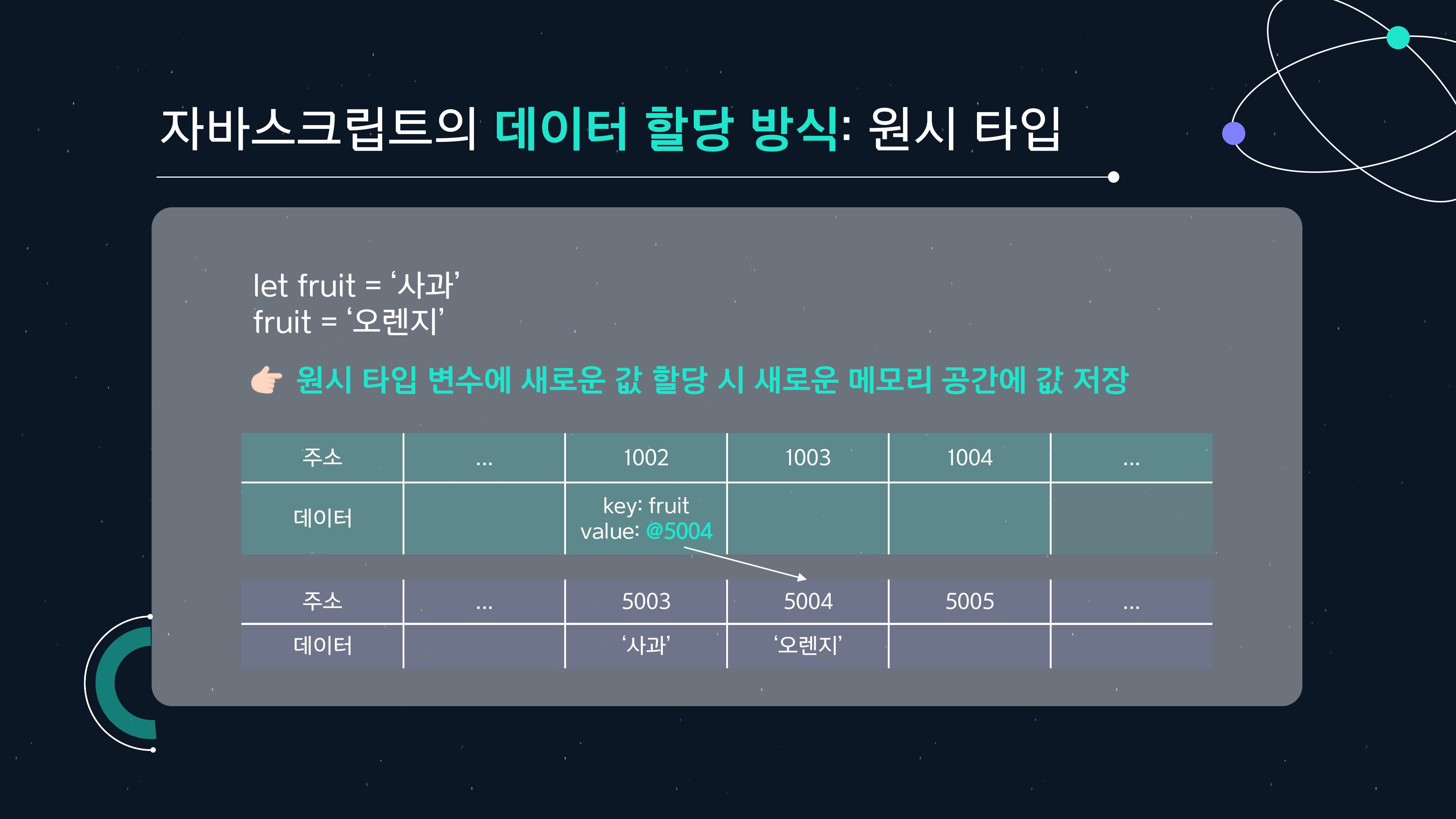 이후, fruit 변수에 '오렌지'를 재할당하면 기존 값을 변경하는 것이 아니라, '오렌지'를 저장할 새로운 메모리 공간이 할당된다.