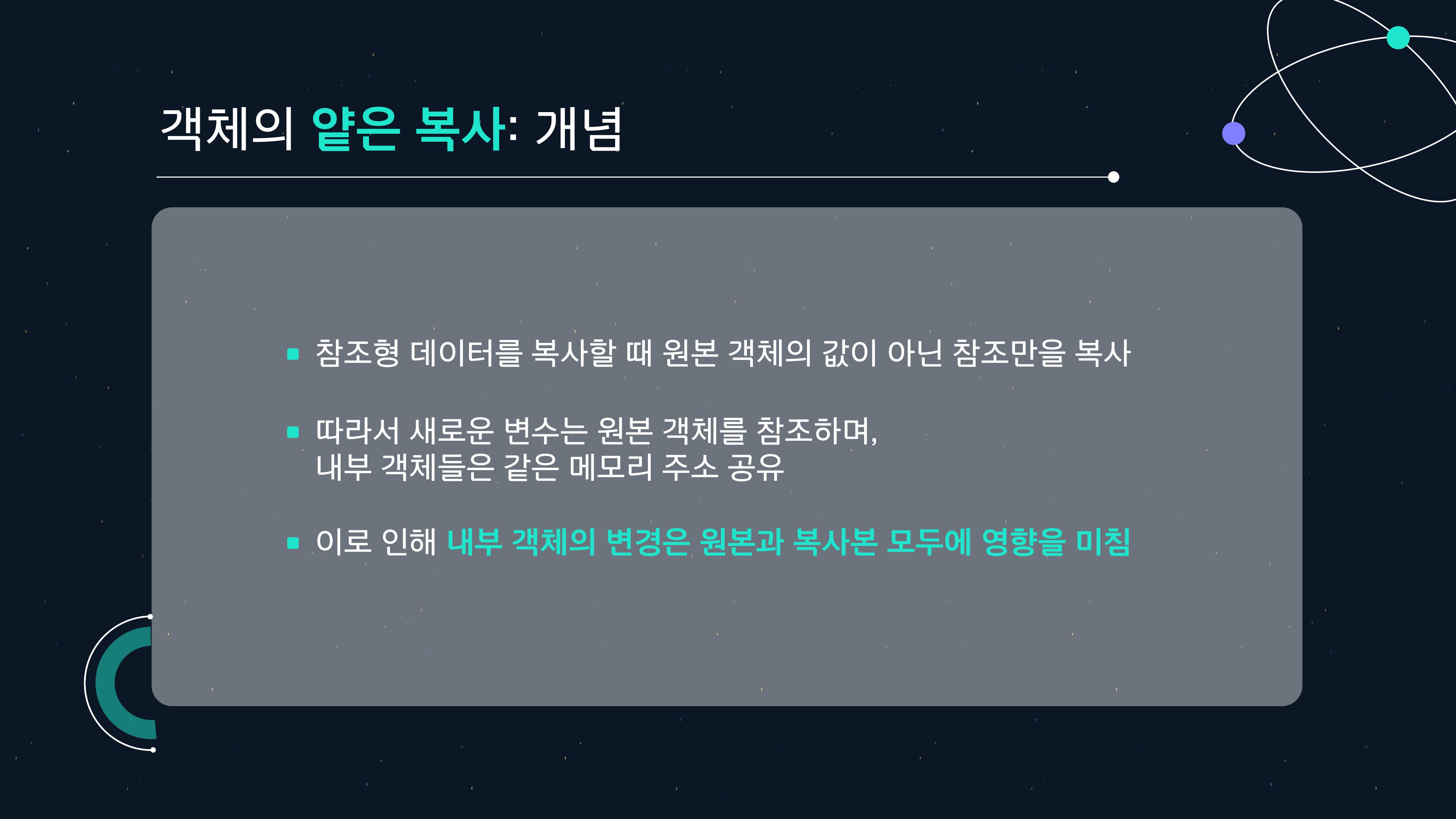 얕은 복사는 객체의 참조 값(메모리 주소)만 복사하는 방식이므로, 원본과 복사본이 동일한 객체를 참조하게 된다. 따라서 복사한 객체의 중첩된 속성을 변경하면 원본에도 영향을 미친다.