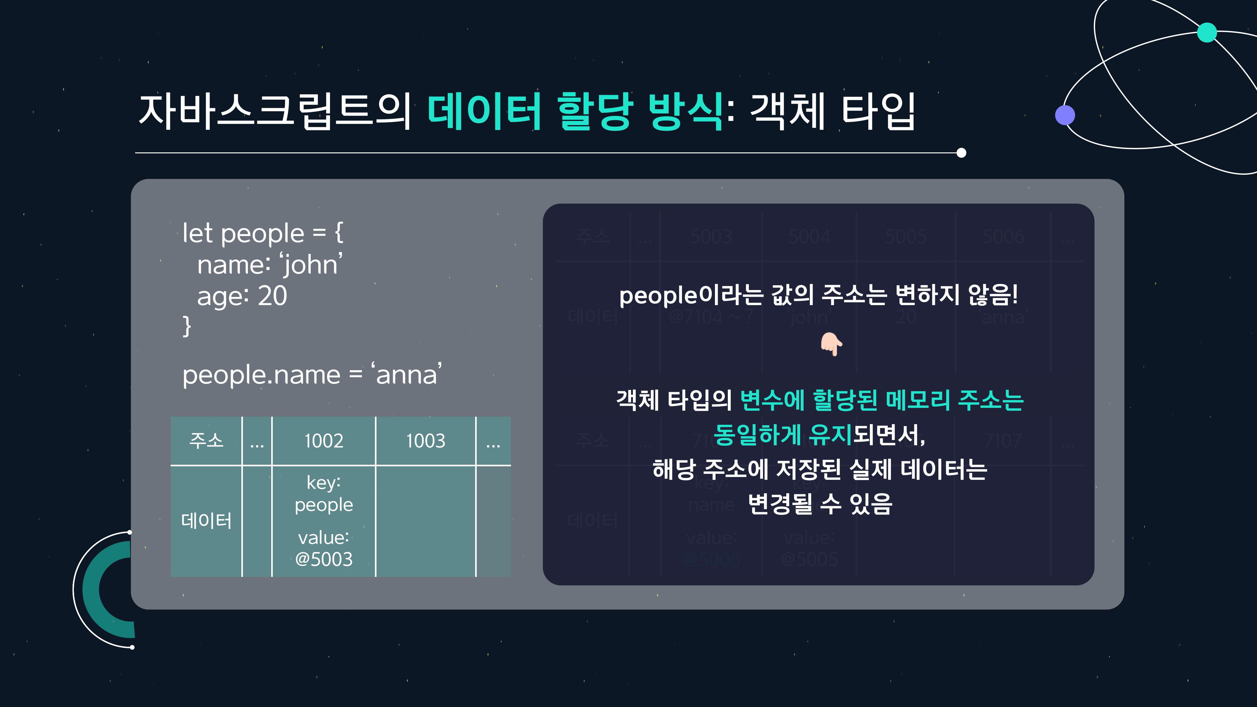 이후 people 변수의 name에 'anna'를 재할당하면, name 키의 value값이 anna라는 원시 값의 주소를 바라보도록 수정된다.