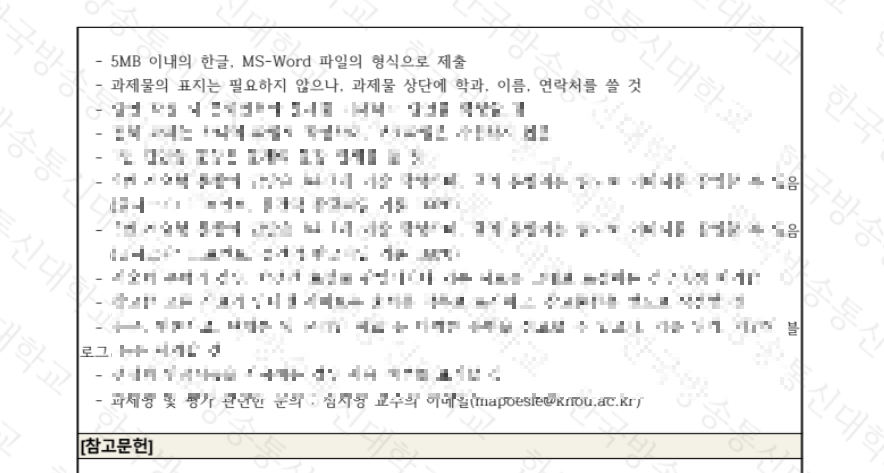✔️ 대체로 출석수업 마지막 즈음에 교수님이 출석수업 과제물 안내를 해주신다. 이걸 놓치거나 출석수업 과제물을 제출하지 않으면 출석수업 점수가 인정되지 않는다.