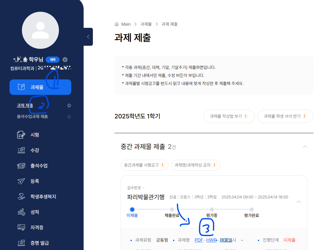 ✔️ 기간 내 제출하지 않으면 중간과제물 점수는 0점 처리되며, 과제물 마지막 날은 18시까지만 제출 가능하니 유의해야 한다.