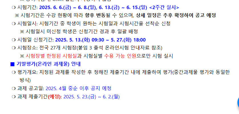 ✔️ 기말고사는 고시된 응시 기간 내 본인이 소속된 지역대학에 가서 오프라인으로 시험을 응시하면 된다.
