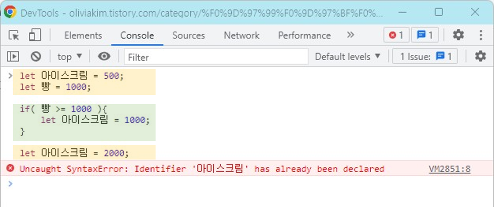 또한 let은 var의 문제점으로 말했던 '같은 레벨 내의 중복선언' 도 해결할 수 있다. 위와 같이 같은 레벨(노란색)에서 아이스크림 변수를 선언한 후, 이후에 다시 동일한 변수명으로 중복 선언을 하면 아이스크림 변수는 이미 사용되었다 ('아이스크림' has already been declared)는 에러를 띄워준다.