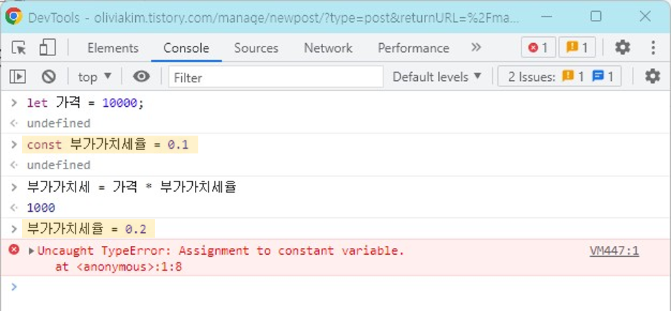 이후 기존에 이미 선언한 부가가치세율의 값을 0.2로 변경해 재할당하려고 하면, 자바스크립트는 너가 const로 선언한 부가가치세율값은 바꿀 수 없는 값인데 왜 바꾸려고 하니? 라며 에러를 띄워준다.