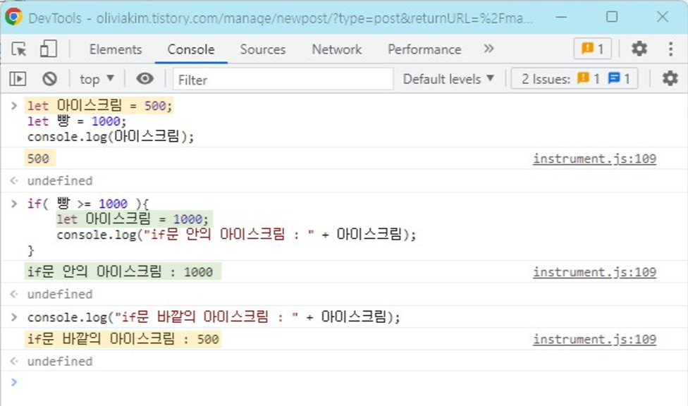 let으로 변수를 선언한 후에 콘솔을 찍어보면, 원하는 결과값을 출력할 수 있다. if{} 안에서 다시 선언된 let 아이스크림 = 1000;은 괄호가 끝나면 더이상 괄호 바깥의 코드에 영향을 주지 않고, 맨 위에 작성했던 500값이 그대로 출력되는 것을 확인할 수 있었다.