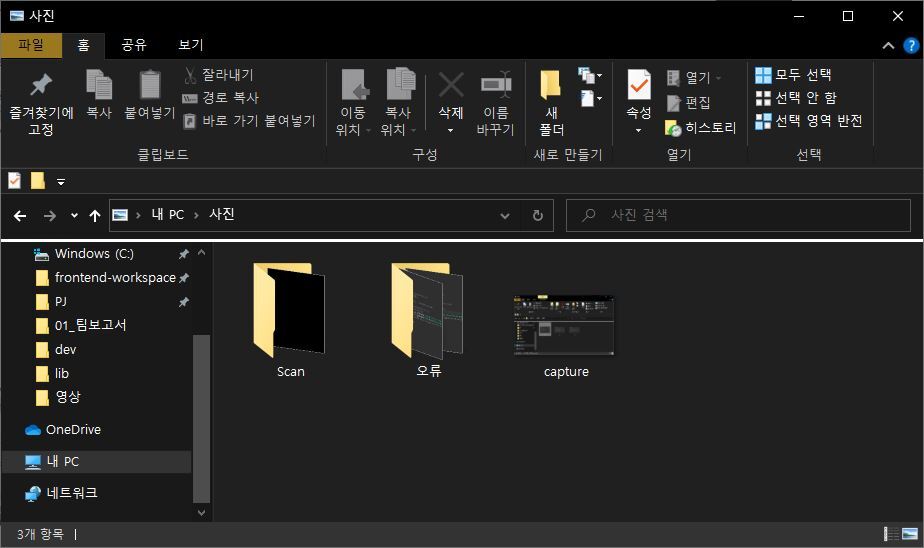 [내 PC]의 [사진] 폴더 안에 [Scan], [오류] 폴더가 있으며 동등한 위치에 'capture.jpg'가 있다.