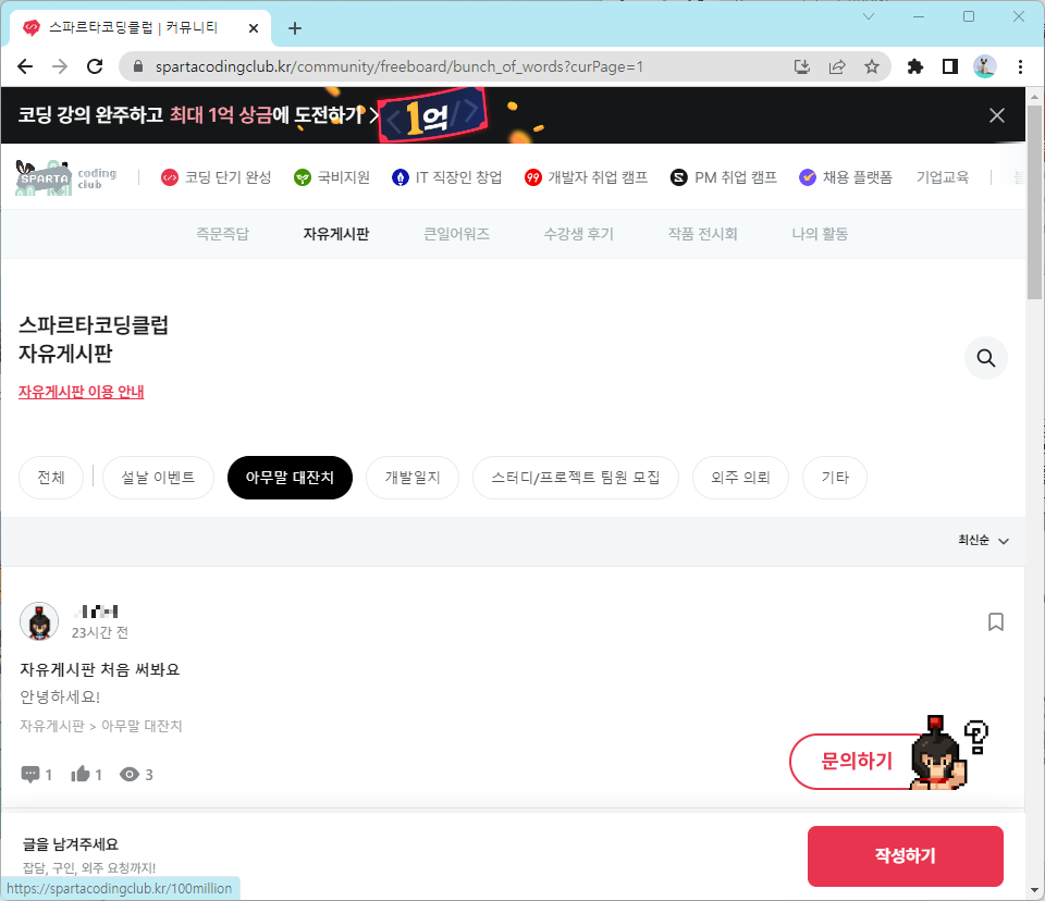 해당 웹페이지의 게시판 내 특정 카테고리를 선택했을 때, 사진의 주소창과 같이 URL 끝에 ?curPage=1이 붙는 것을 확인할 수 있다. 이를 쿼리스트링이라고 하는데, 사용자가 입력한 데이터를 전달하는 방법 중 하나로 URL 주소에 미리 협의된 데이터를 파라미터를 통해 넘기는 것을 말한다. curPage는 별도 설정해 둔 key의 이름으로 해당 페이지에서는 '페이징 번호' 값이 1페이지임을 나타내고 있다.