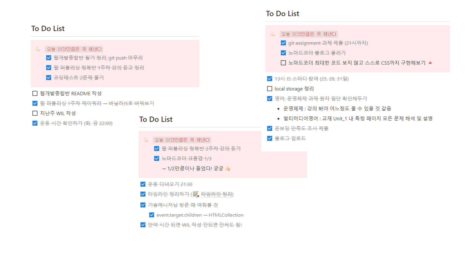 | 이번주에 해낸 것 | 이번주에 하지 못한 것 |