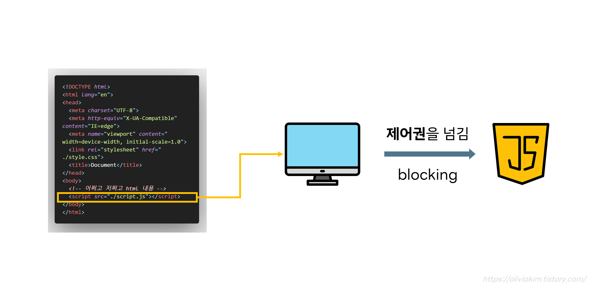 CSS를 파싱할 때 link나 script를 만나면 그 아래의 DOM 생성을 멈추고 CSSOM을 생성했던 것 처럼 script 태그도 동일하다. 다른 점은 CSSOM도 렌더링 엔진이 만들었다면, script 태그 내의 자바스크립트 코드를 파싱할 때는 렌더링 엔진이 자바스크립트 엔진에게 제어권을 넘긴다. (이를 blocking이 일어났다고도 한다!) 이후 자바스크립트 파싱과 실행이 종료되면 렌더링 엔진으로 다시 제어권이 넘어가 HTML 파싱이 중단된 시점부터 다시 시작하여 DOM 생성을 재개한다.