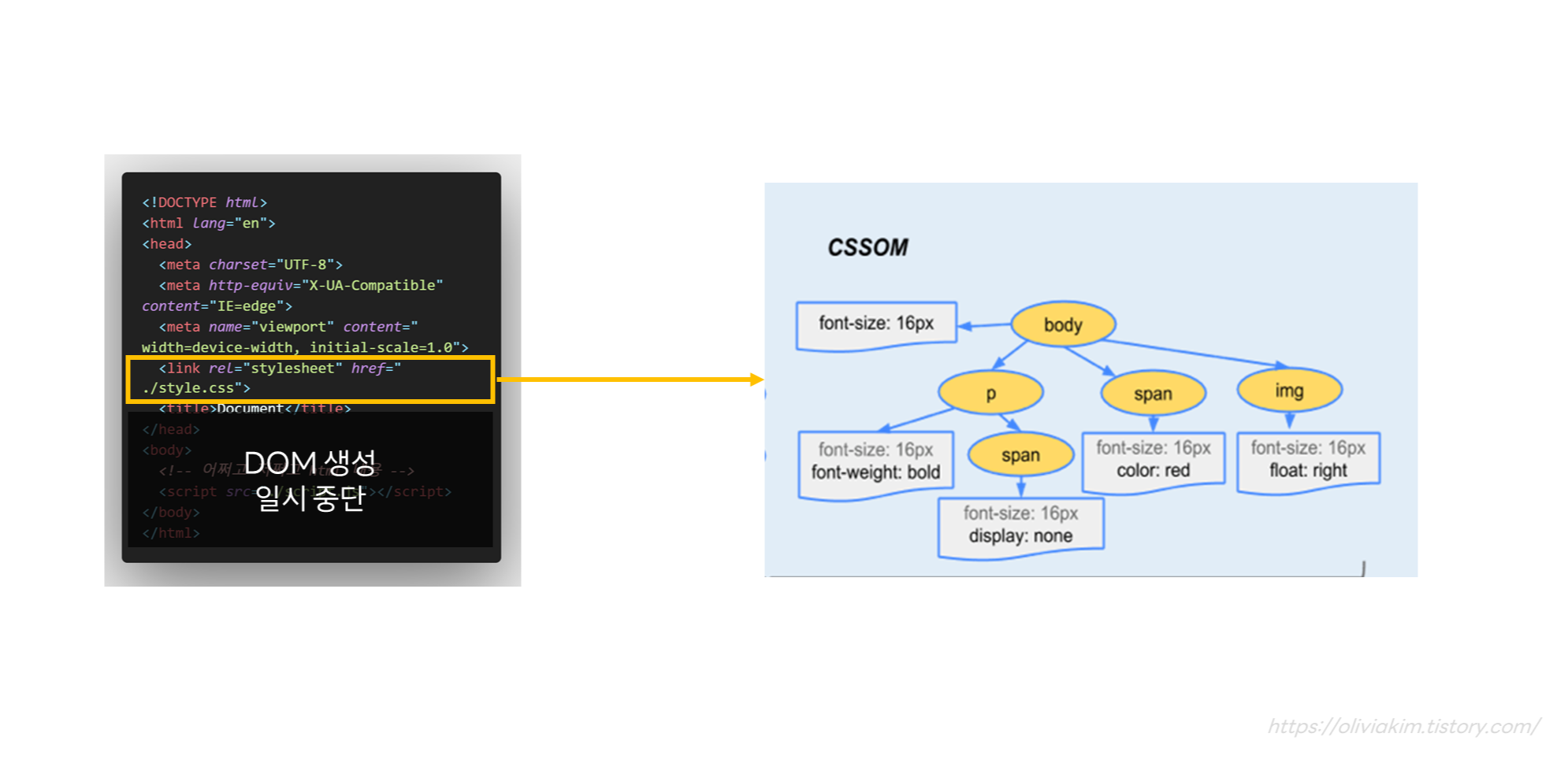 렌더링 엔진(내용 정보인 HTML, XML과 서식 정보인 CSS, XML 등을 읽어 들여 사람이 읽을 수 있는 문서로 표시하는 웹 브라우저의 핵심 기능을 담당하는 소프트웨어)은 처음부터 한 줄씩 순차적으로 파싱하며 DOM을 생성한다. 이때, 중간에 CSS를 로드하는 link나 style 태그를 만나면 DOM 생성을 일시 중단한다.