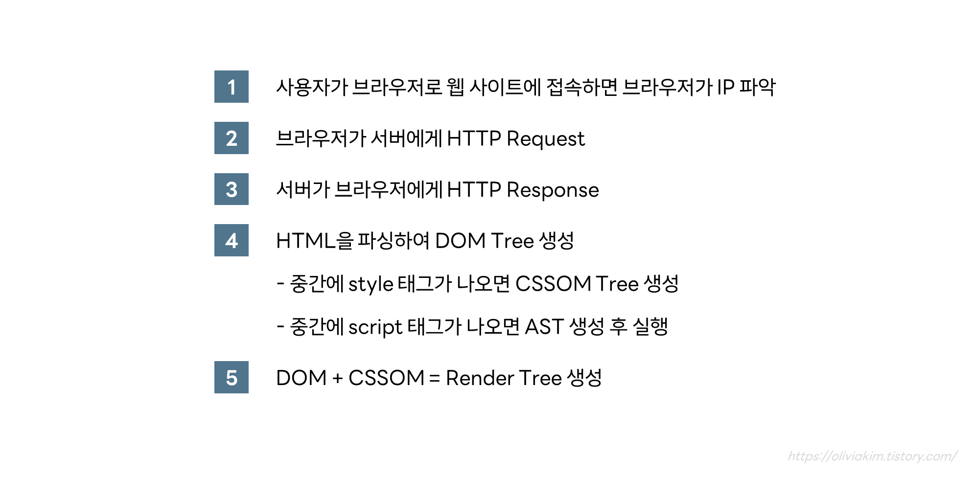 지금까지 공부한 내용을 기반으로 브라우저 렌더링 순서를 다시 한번 정리해 보자. 위의 사용자가 웹사이트에 접속하여 주소를 기반으로 IP를 파악하고 서버에 요청, 응답한 HTML을 파싱해 DOM Tree를 만들고 CSSOM까지 더해 Render Tree를 생성해 주는 1~5의 과정을 Counstrunction이라고도 한다.
