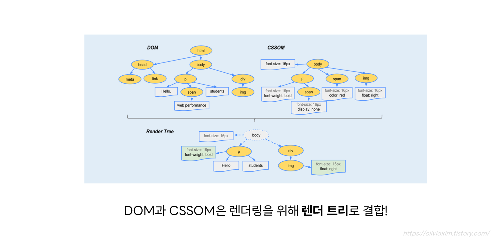 DOM과 CSSOM이 생성되면 이 둘은 렌더링을 위해 렌더 트리(Render Tree)로 결합된다. 렌더 트리는 브라우저 화면에 보여지지 않는 것들은 포함하지 않는다. (HTML meta 태그, CSS의 display: none 등) 즉, 렌더 트리는 브라우저 화면에 렌더링되는 노드만으로 구성된다.