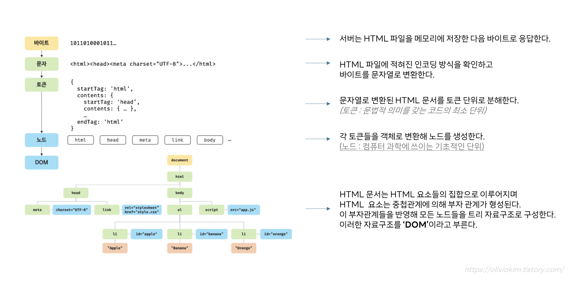 HTML을 브라우저가 아니라 메모장 같은 다른 응용 프로그램으로 열어보면 왼쪽과 같이 일반 문자열로 나타난다. 이처럼 브라우저가 요청을 해서 서버가 응답으로 보내주는 HTML문서는 문자열로 이루어진 순수한 텍스트다. 따라서 브라우저가 이를 이해하고 사용자에게 최종적으로 보여주는 과정을 실행하기 위해서는 브라우저가 이해하도록 번역하는 과정이 필요하다.
