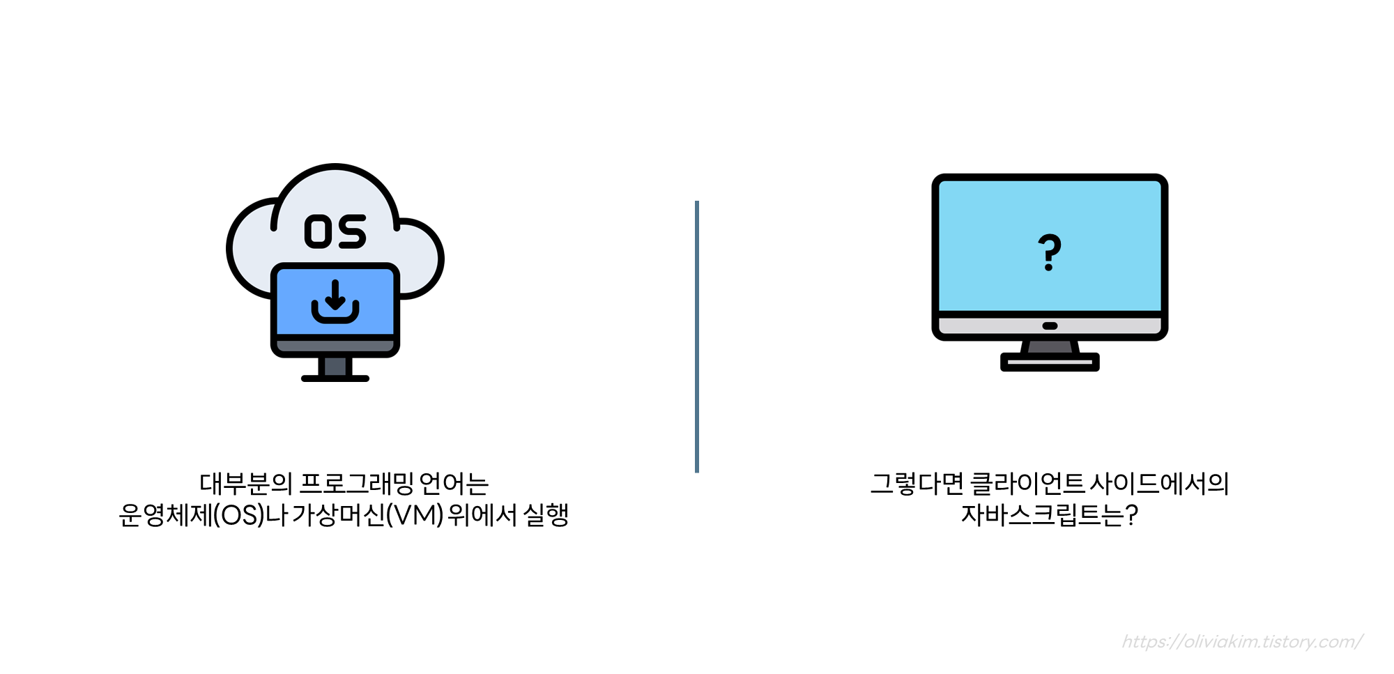 C나 JAVA와 같은 대부분의 프로그래밍 언어는 운영체제나 가상머신 위에서 실행된다. 자바스크립트도 런타임 환경에서 사용한다면(node.js) 이야기가 다르겠지만, 프론트엔드 개발자가 개발할 클라이언트 사이드에서의 자바스크립트는 어떻게 실행될까?