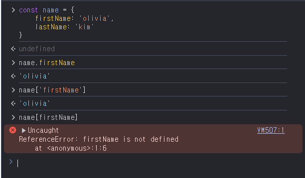 변수에 담겨있는 값을 이용해 프로퍼티에 접근할 때는 대괄호 표기법을 사용한다. 점 표기법으로는 변수와 같이 동적인 값으로 접근이 불가능한데, 이때 ReferenceError가 발생하는게 아니라 undefined를 반환한다.