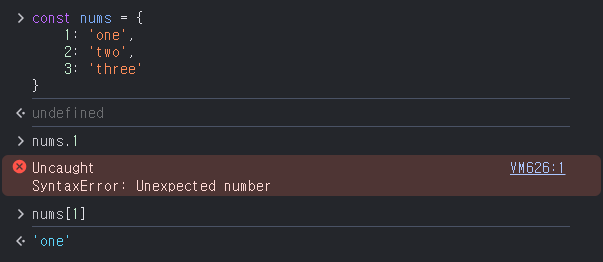 다만, 프로퍼티 키가 숫자일 경우에는 그대로 사용할 수 있다. 이때 점 표기법으로는 키가 숫자인 프로퍼티에 접근이 불가능하다.